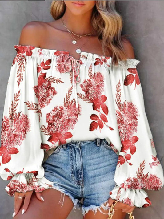 V-Neck Lantern Sleeve Curved Pendant Floral Print Chiffon Top