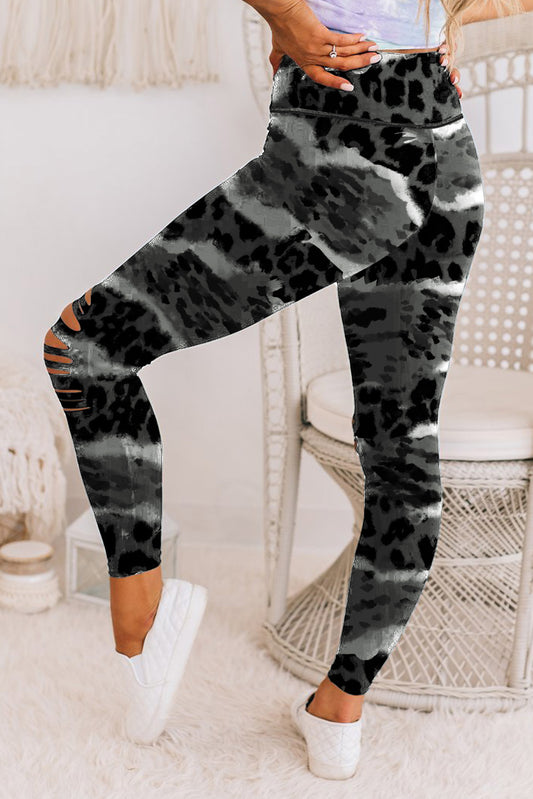Black Printed High Rise Cheetah Print Ripped Leggings